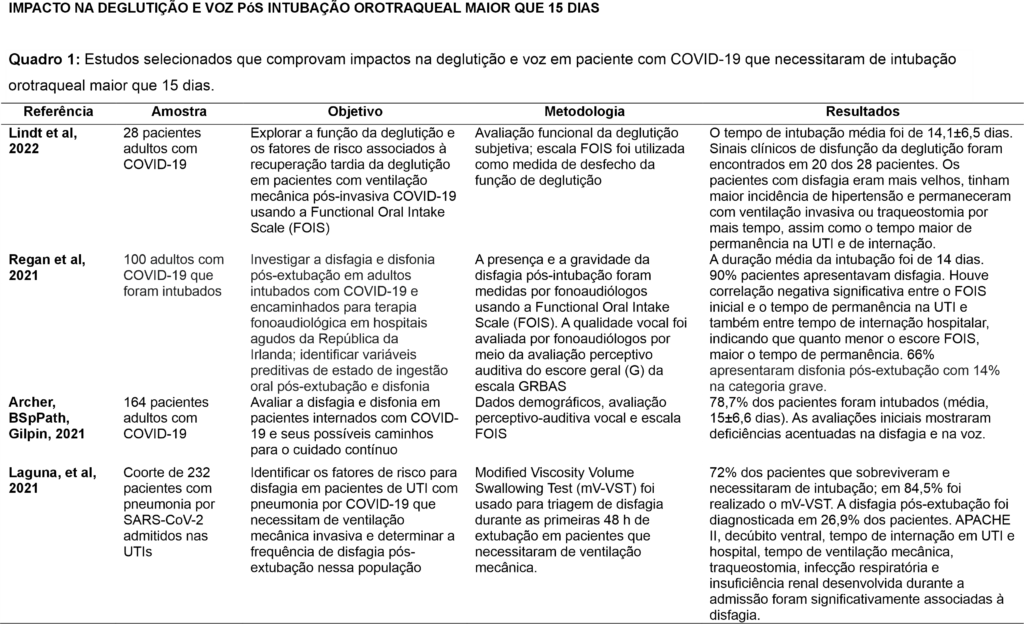 Os estudos incluídos na revisão sistemática foram de delineamento coorte, transversal e estudo de caso e foram conduzidos no Brasil, Inglaterra e Irlanda. O número de participantes entre os estudos variou de 20 a 200 pacientes e a média de tempo de IOT foi de 15 dias. O quadro 1 mostra os estudos selecionados, que apresentam os impactos na deglutição e voz em pacientes com Covid-19 e que necessitaram de intubação orotraqueal maior que 15 dias.