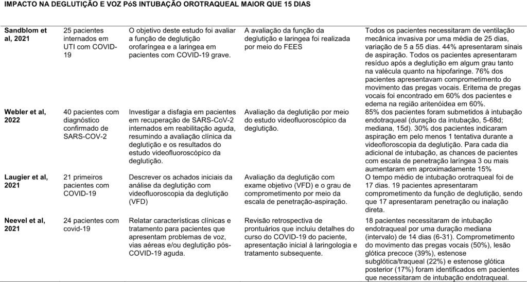 Trata-se de uma revisão de literatura na qual apresentou a seguinte questão norteadora: quais as evidências disponíveis para o impacto na deglutição e voz envolvidas em pacientes com COVID-19, que necessitaram de intubação orotraqueal superior a 15 dias?