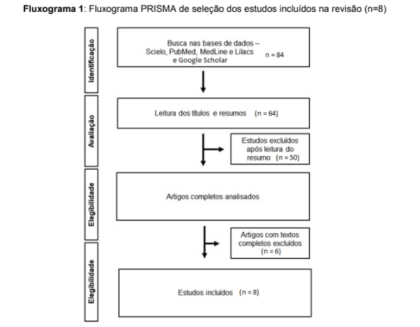 A busca na base de dados encontraram 84 artigos, resultando em estudos que foram removidos e apenas 08 selecionados para serem incluídos na revisão sistemática.